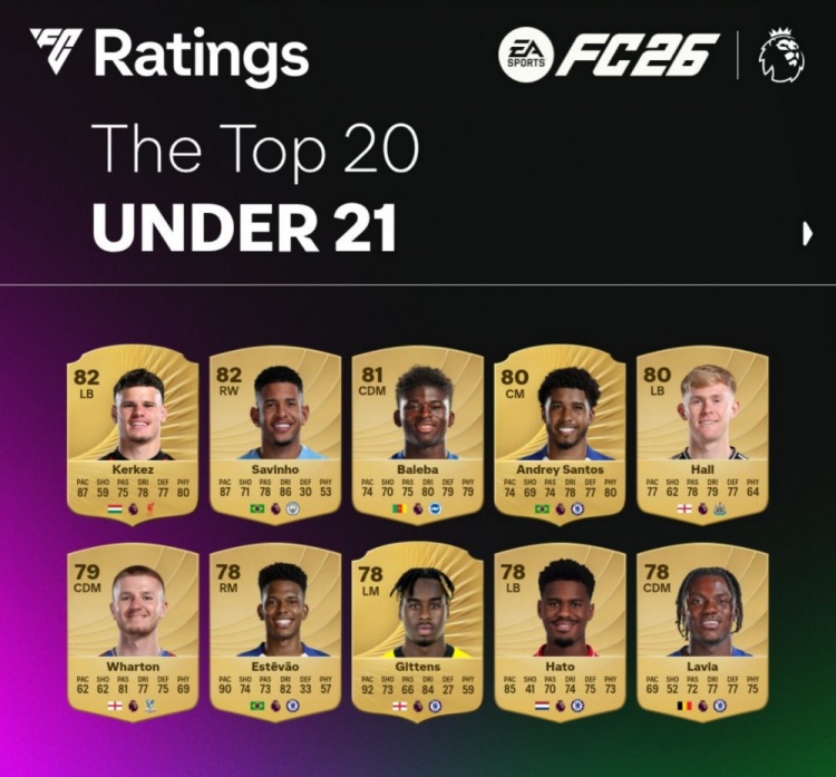 9月9日讯 EA官方公布了FC26英超U21球员评分榜,科尔克兹、萨维尼奥最高,具体如下: